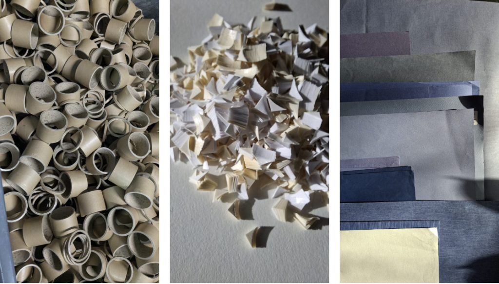 récupération de matériaux, collecte de chutes de production industrielles, pigments et finitions inoffensifs pour les humains et la nature.
